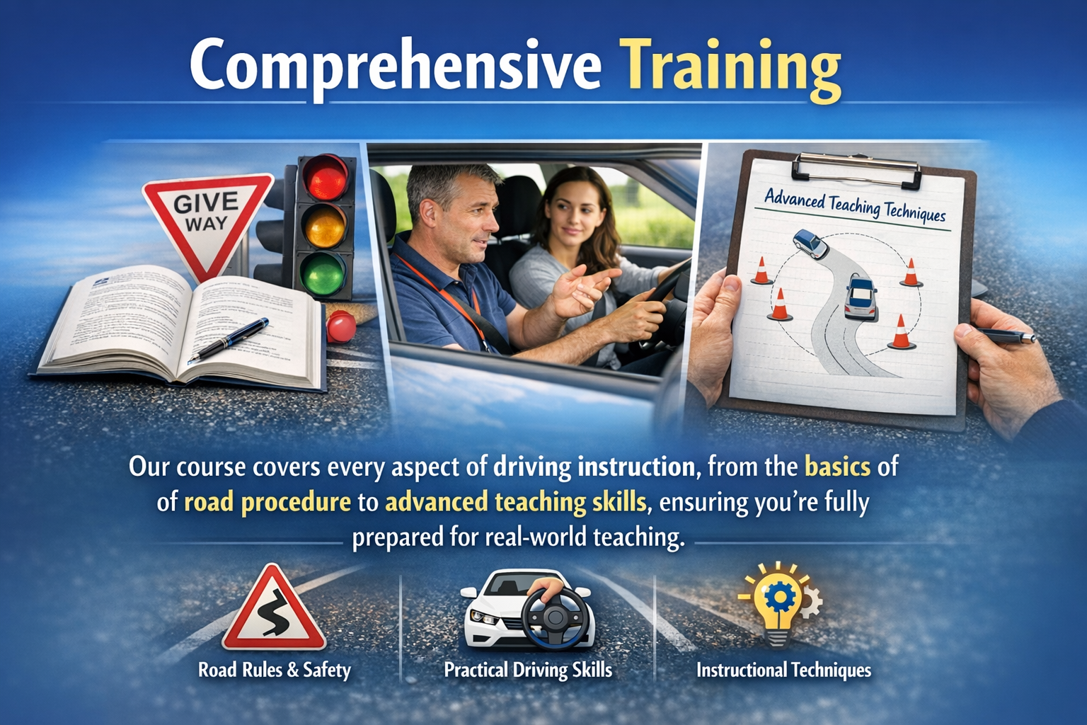 Our course covers every aspect of driving instruction, from the basics of road procedure to advanced teaching skills, ensuring you’re fully prepared for real-world teaching.